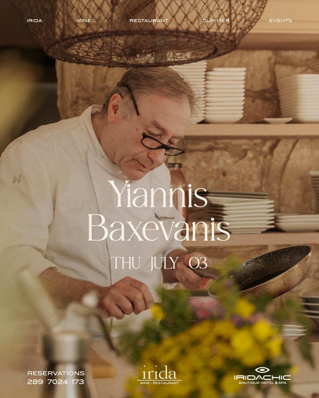 Following the success of his previous appearances, Chef Yiannis Baxevanis returns to Irida Wine Restaurant for an extraordinary evening of Cretan gastronomy. Known as the ambassador of Greek culinary heritage, Chef Baxevanis will once again bring his innovative spirit to the table — where tradition meets refinement.